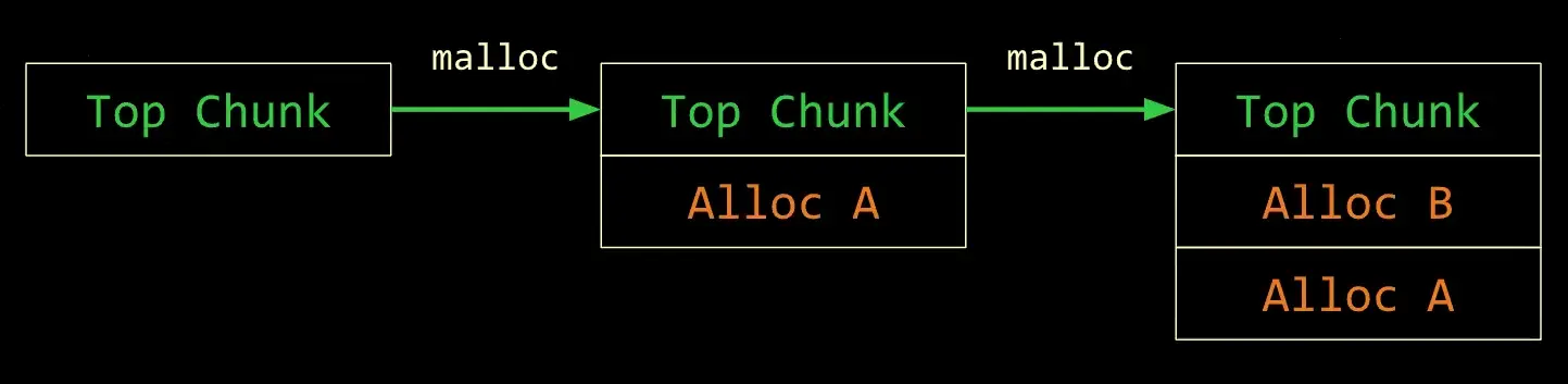 - Allocate a chunk, and get B, allocate another chunks and you get the stack’s address