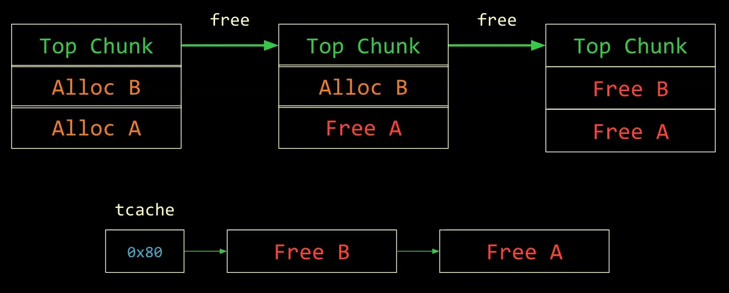 - Free these two chunks to get them into the Tcache Bin free list