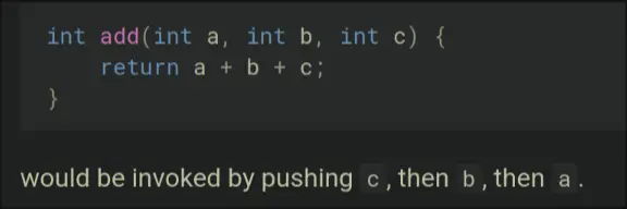 - Arguments are placed onto the stack from right-to-left