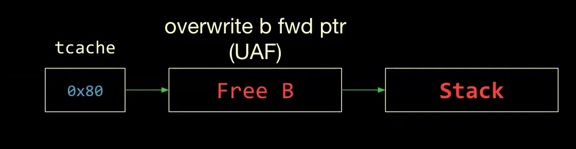 A heap attack that uses UAF to overwrite metadata of a Tcache Bin to point to a stack address that we can retrieve from a subsequent malloc