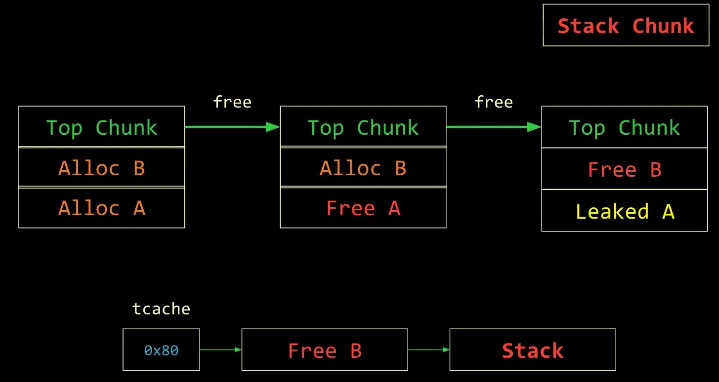 - Allocate a chunk, and get B, allocate another chunks and you get the stack’s address