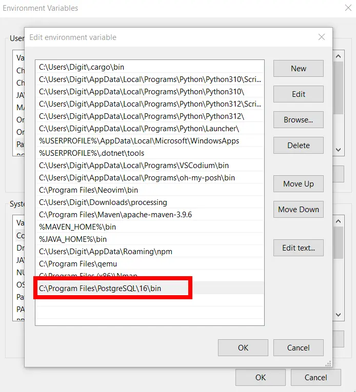 - Add postgresql bin directory to PATH environment variable