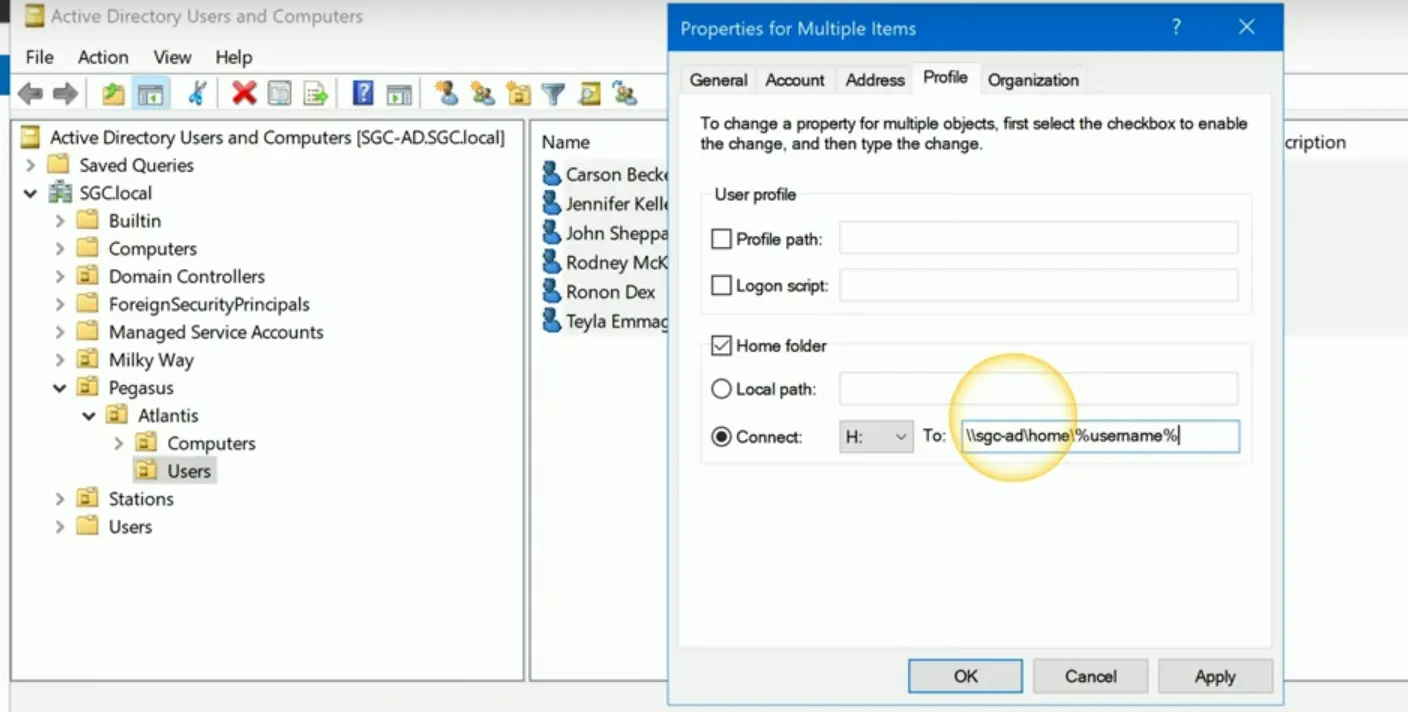 Users and Computers > Users > User to change > Profile > Home Folder > Setup a mount point and drive > OK
