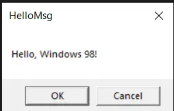 MessageBox (NULL, TEXT ("Hello, Windows 98!"), TEXT ("Somewindowname"), MB_OK | MB_CANCEL) ;
