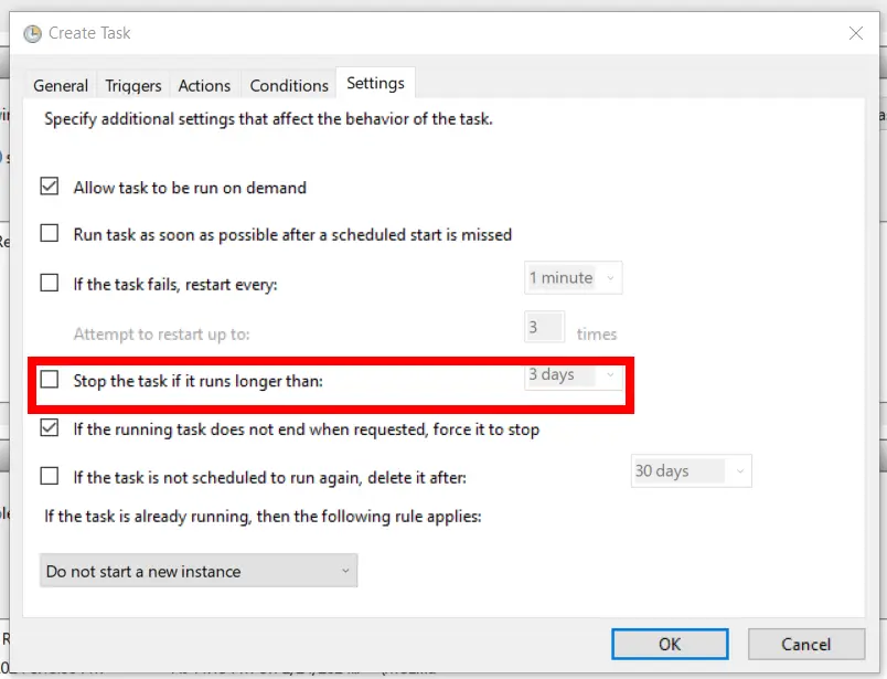 5. In the settings, uncheck the stop task after …