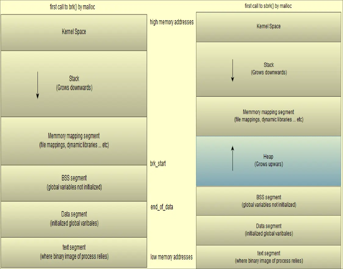 End_data: pointer that sets end of data segmentstart_brk: pointer that denotes beginning of heapBrk / program break: pointer that denotes end of heap segment- brk() used to initialize